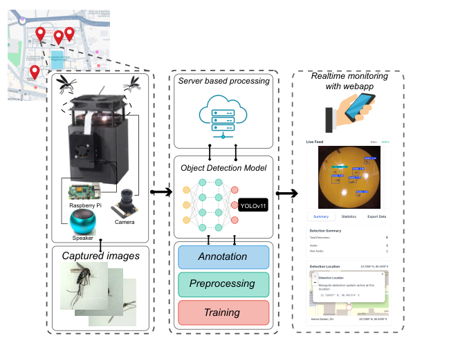 Overview of the proposed Aedes surveillance system. The system integrates remote capture devices with a central server for real-time monitoring of Aedes population. Client devices send live video frames to the server. The server employs YOLOv11 object detection model to identify and count Aedes mosquitoes in the frames. A web dashboard is used to access the Aedes detection results from the server.